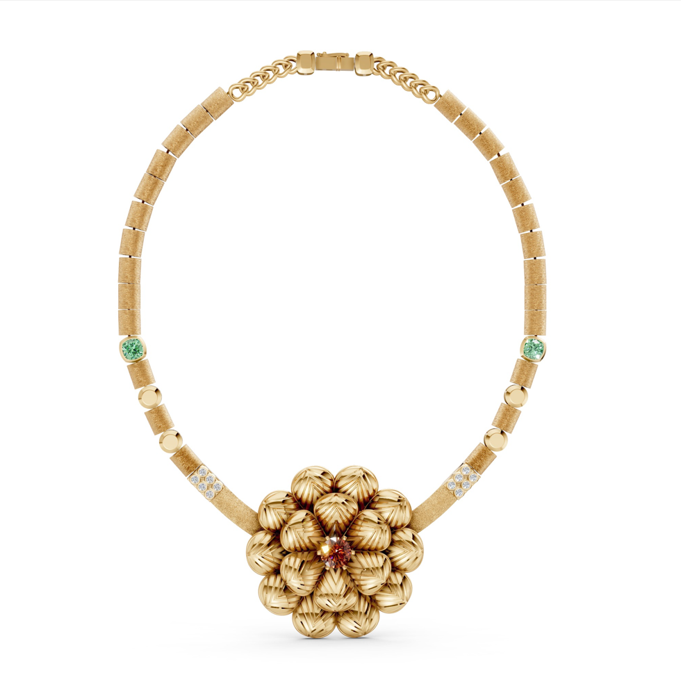 Built from solid 24K yellow gold, the necklace showcases a bold floral centerpiece designed with both polish and brushwork for a rich, tactile contrast. It’s a reminder that legacy isn’t just remembered - it’s built, layer by layer, choice by choice.