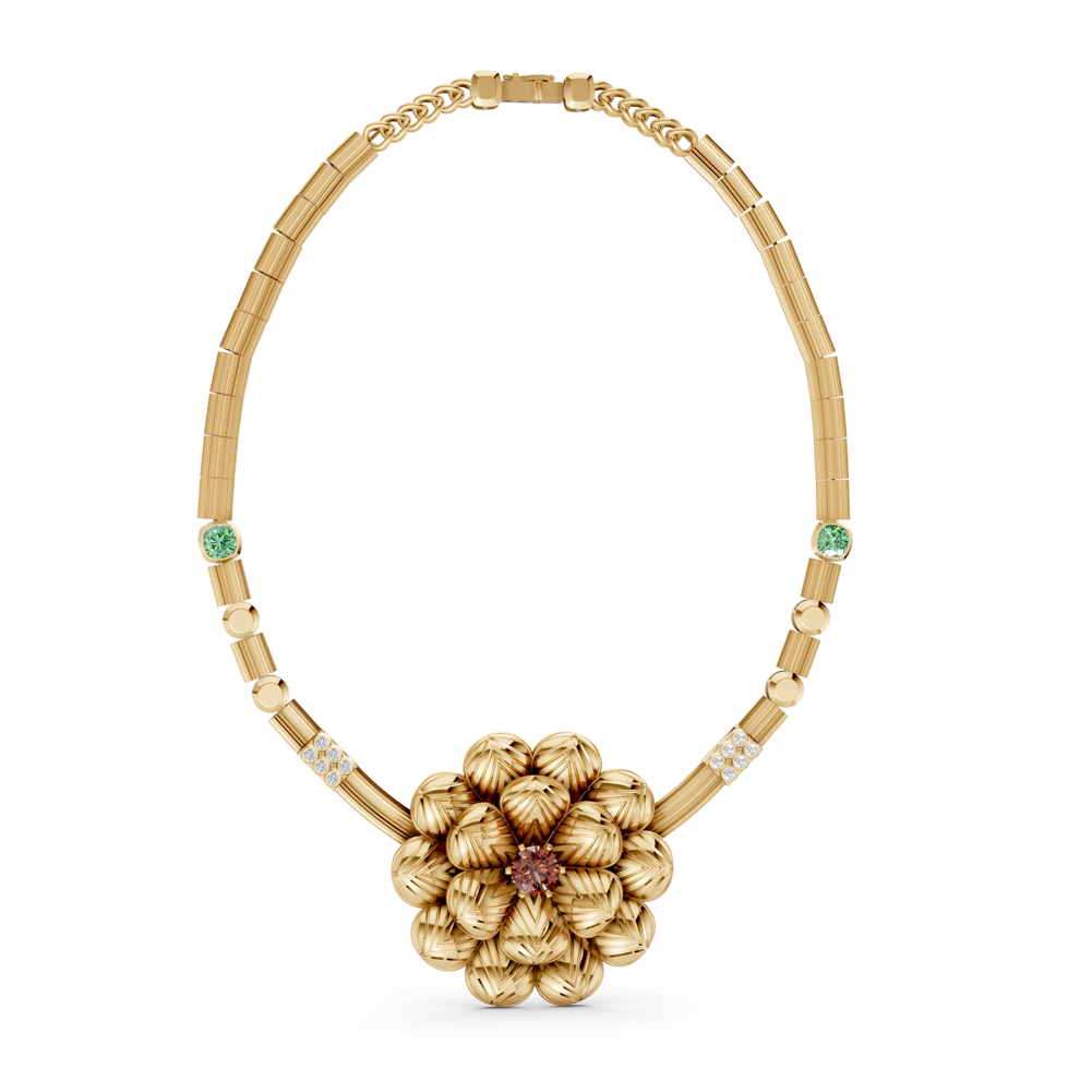 At its center: a floral form shaped in 24K ribbed yellow gold, each petal a fold of textured memory. It’s not a perfect bloom - because life rarely is. But it is whole. Steady. Made with care.