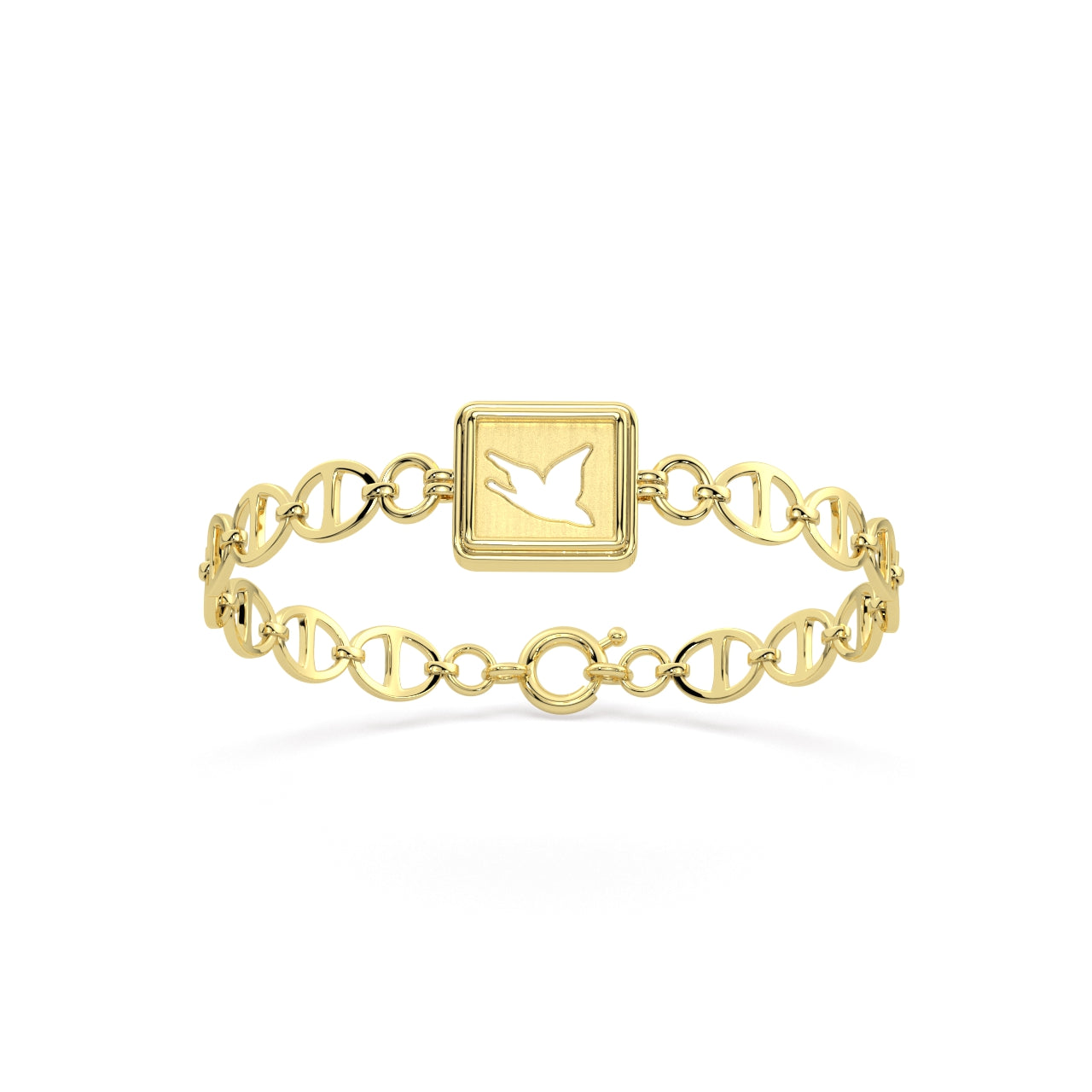 At its heart lies a dove in flight, gently etched into a square golden plaque. The surrounding vine-link chain is composed of sculpted ovals - a continuous motif of enduring connection, like names passed down or stories told at a grandmother’s table. It is a design built not for trends, but for remembrance.