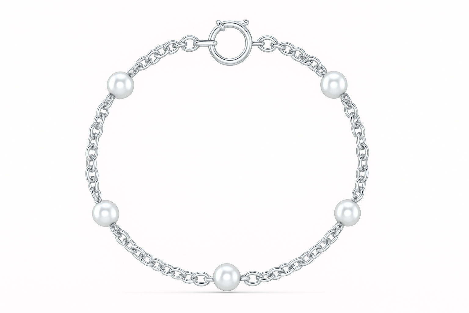 This version trades motif for minimalism. Five luminous pearls are spaced with intention along a sterling silver chain, their rhythm echoing breath, memory, and the weight of words left unsaid. Each pearl is a point of reconnection - moments of softness suspended between stronger links.